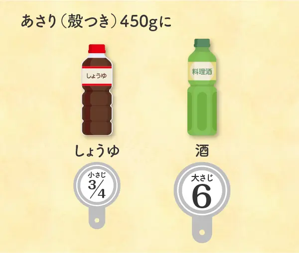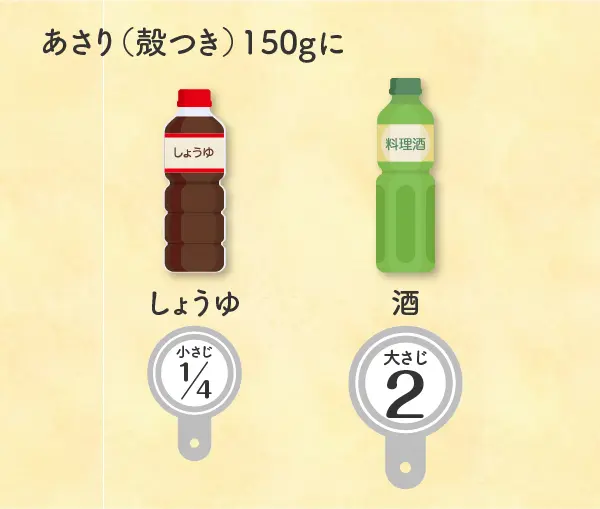 あさりの酒蒸しの味付け 2025.10.15 和風 基本魚介類 1人分2人分3人分4人分 ・しょうゆ…小さじ1/4・酒…大さじ2 ・しょうゆ…小さじ1/2・酒…大さじ4 ・しょうゆ…小さじ3/4・酒…大さじ6 ・しょうゆ…大さじ1・酒…大さじ8